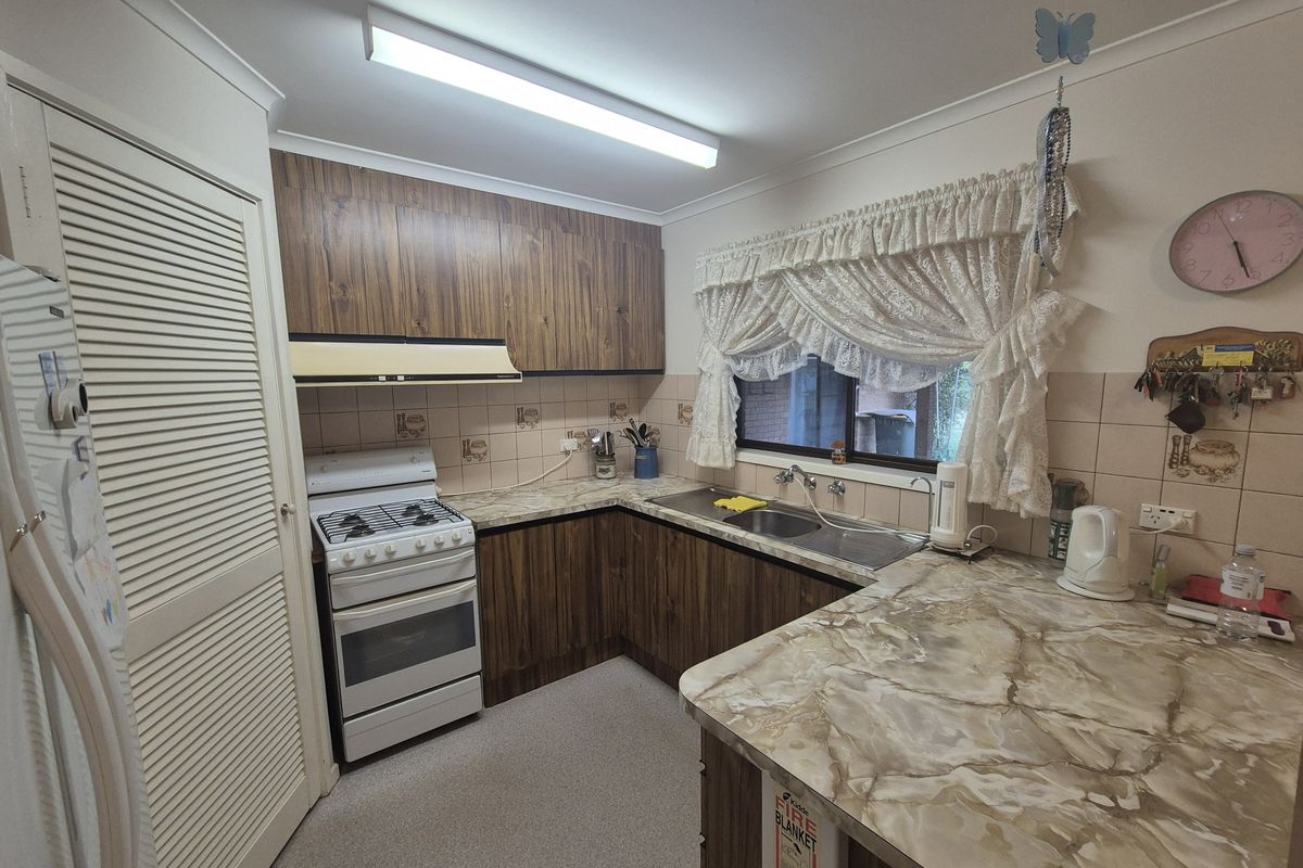 Comprising a family lounge with a decorative timber cabinet across one wall, flowing through to the dining then kitchen area. Kitchen offers gas oven/cooktop, ample cupboards, bench space and handy pantry. There are 3 main bedrooms with the master suite having twin built-in robes and a mirrored built-in dressing table. 2 well kept bathrooms, each with shower, vanity and toilet, with family bathroom also having a bath. Separate large ironing/ linen room with fold out ironing board.